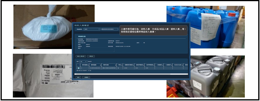 領料管理電子化平台,結合 SAP 系統產出收貨驗收單。收貨站印製條碼,貼在物料外包裝上,建立生產履歷追蹤基礎。原料入倉紀錄物料與儲位。